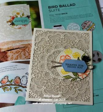 This card is one of the Make ‘n Takes from my New Catalog Open House that took place last Friday. As you can see from the photo above I CASED it right out of the new catalog. The Bird Ballad Laser Cut Card Tin is easily overlooked in the catalog but the card bases are stunning in real life! You get 12 card bases with the laser cut fronts and matching scalloped edge envelopes all in very vanilla and they come in a pretty pink floral tin,