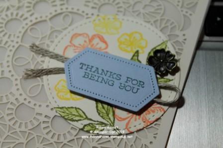 For this card, we placed a piece of vellum cardstock behind the laser cut front. I cut the vellum just a smidge smaller than 4 1/4″ x 5 1/2″ and we glued them on with Liquid Multi Glue. Just a lay a small bead around the frame on the inside of the card and then add the vellum. I love the silvery glow that the vellum gives the card. The circle of very vanilla is cut using one of the Stitched Shapes Framelit Dies and then stamped. I love the Braided Linen Thread for a natural look. I think it keeps the card from being overly frilly. The label is cut with the new Stitched Nested Labels Die from a piece of Seaside Spray cardstock, which is one of the new In-Colors.