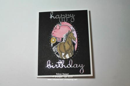 First, I stamped 4 cows from the Over the Moon stamp, 4 pigs from This Little Piggy and the large horse from the Let It Ride stamp set.