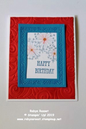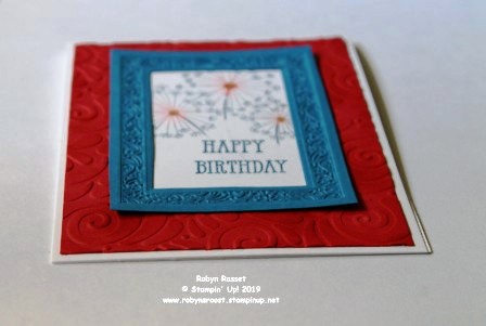 The 4″ x 51/4″ Poppy Parade layer is embossed with the Swirly Embossing Folder and then sponged randomly with Poppy Parade ink.