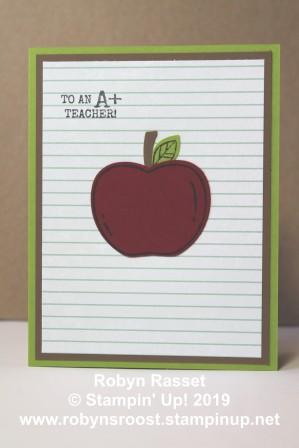 The ‘note paper’ is a pattern from the Come to Gather Designer Series Paper. It definitely sets the mood for a teacher or school themed greeting card. To recreate this card, cut the soft suede layer to 5 1/4″ x 4″ and the Come to Gather DSP to 5″ x 3 3/4″.