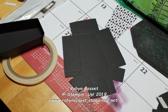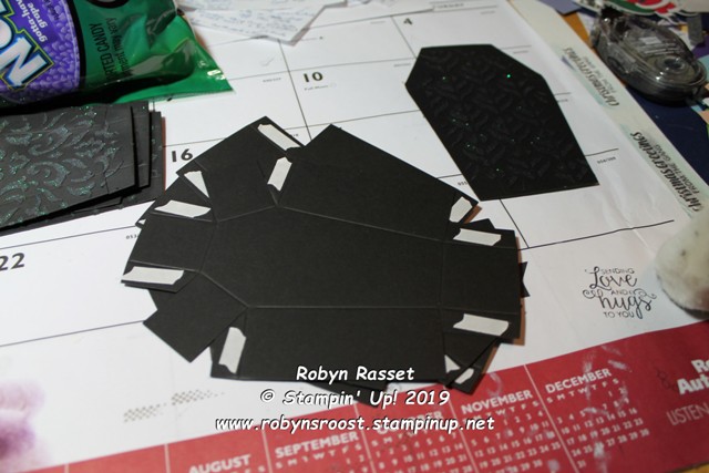 I added the tape to the tabs first, then folded on all the score lines, and then removed the protective from the adhesive one tab at a time to put the boxes together. The coffin tops with the embossing paste were a bit harder to do on the ones that I got embossing paste on the tabs, but it all worked out fine.