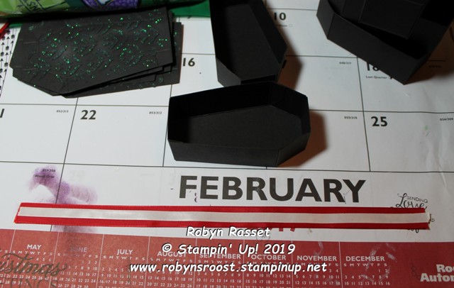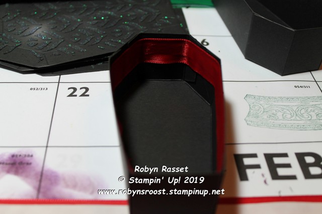 For an added touch, I adhered some ribbon to the inside edge of the coffin bottom. I wish the ribbon had been wider, but when doing things last minute, use what’s available. To adhere the ribbon, I added a strip of Tear n Tape to the back side, and then peeled it off as I went around the coffin.