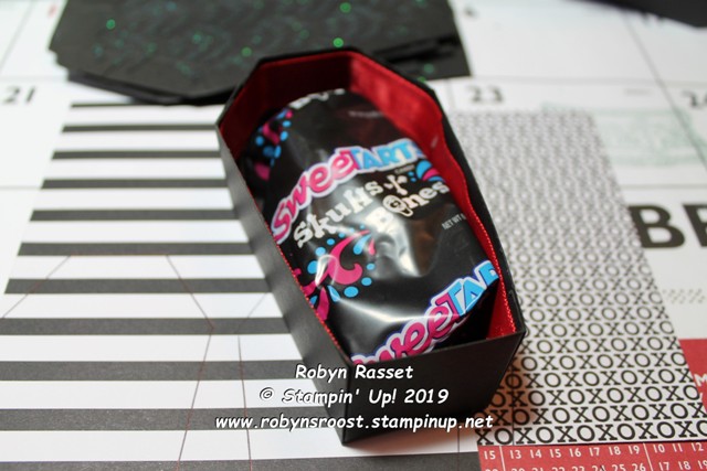 I added a fun designer series paper to the inside bottom as well. I just traced around the bottom of the coffin and then cut inside my lines to fit. Of course, once the Sweet Tart Skulls n Bones candy bags were inside, the bottom paper didn’t show.