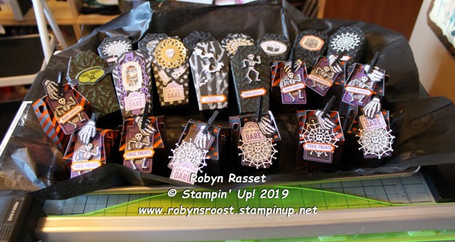 The Stampin’ Up! Coffin Treat Boxes were easy to put together. There are so many fun ways that these could be decorated, but of course, I was doing these the night before the party so I stuck with one basic design. I used the Basic Pattern Masks and either white ink or Shimmery Embossing Paste which was colored black.