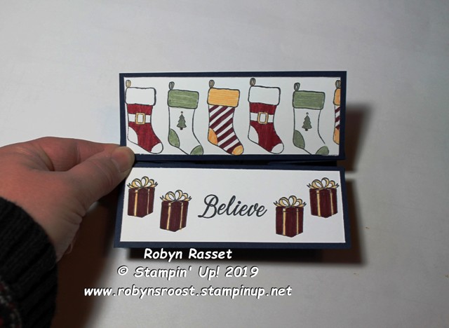 5. Outside flaps cut 2 pieces of whisper white cardstock 4 3/4″ x 1 3/4″. Stamp stockings and presents from the Holly Jolly Christmas stamp set. Color using Stampin’ Write Markers