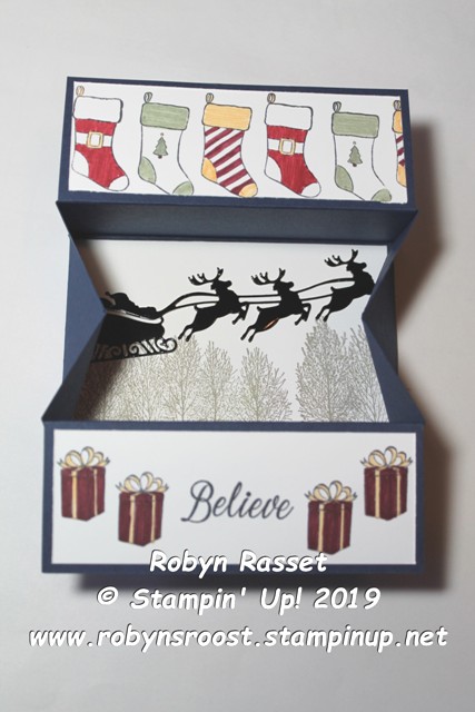 This cool Box Card Technique is a fun way to make a 3D greeting card. For inspiration to design this card, I thought back to my childhood and remember looking out the window hoping to catch a glimpse of Santa and his reindeer. I imagined the box flaps being the window frame so I hung stocking on the top and placed presents on the bottom.