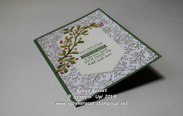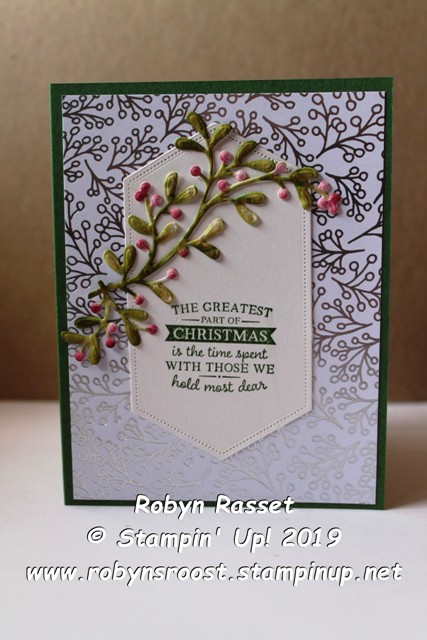 To add some texture to this shinny Feels Like Frost Designer Series Paper, I cut the leaves from a folded napkin with the Christmas Layers die. Next I painted the die cut with an aqua painter using old olive and cherry cobbler inks.