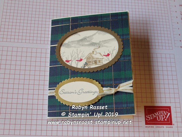 Then I cut an oval out of the plaid layer so that the Snow Front picture is behind the plaid layer.For the frame around the Snow Front picture, place 2 oval dies nested together and run through the die cutter to create a frame. The greeting ovals are done by layering 2 ovals