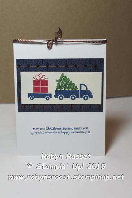 Count them, 17 cute stamps to play with for only $10. Use a top fold card base and add some copper trim. I love the way the copper trim can be formed into bows without having to make a bow. If you have an extra $13 in Hostess Rewards, add on the Greatest Part of Christmas greeting set and get the greeting that is used on the front of this card.
