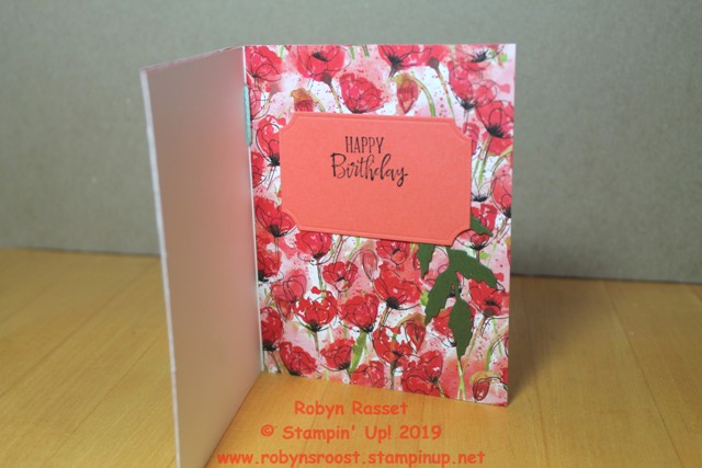 To finish the card front, I added 5 of the sequins from the Peaceful Poppies Sequin Pack. Then to carry the look from the card front to the inside, I adhered a 4 1/8 x 5 3/8″ piece of the Peaceful Poppy Designer Series Paper to the inside as well. The greeting is stamped with Tuxedo Black ink onto a piece of Calypso Coral cut from the Stitched Nested Labels Dies.