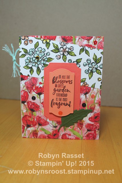 The Peaceful Poppy Designer Series Paper is so pretty that I decided to make it the focus of this card. The Peaceful Poppy Designer Series Paper is cut 4 1/8″ x 5 3/8″ and adhered onto a Thick Whisper White cardbase. I added a 2″ wide strip of Bird Ballad Designer Series Paper, placed at an angle and punched holes in the fold of the card to loop a piece of twine and knot it. When punching the holes, I just punched a half circle right on the fold.
