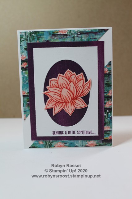If you are unfamiliar with Stampin’ Up!’s Sale-a-Bration, it’s a great time of year to get some extra products for free. From January 3 to March 31, 2020 for each $50 or $100 of product purchased, choose one of the items from the Sale-a-Bration Brochure for FREE. I have used 4 of the awesome free items from the Sale-a-Bration Brochure on this card. The Lasting Impressions Designer Series Paper in the background, the Lily stamp from the Lovely Lily Pad stamp set, the die to cut the lily from the Lily Pad Dies, and the greeting stamp from the Sending You Thoughts stamp set.