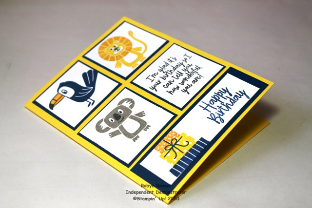 For this card, I chose to leave the Bonanza Buddies Dies in the package and play with the stamp set only. I love how easy the 2-step photopolymer stamps are to line up. These little guys are just plain fun to stamp with. I stamped the main bodies of the animals first, then stamped the accent stamps. The whisper white pieces are cut 1 3/4″ square and layered onto pieces of blueberry bushel piece that is cut to 1 7/8″ square for a narrow matt. The measurements for the bottom strip are 1″ x 3 1/2″ for the whisper white piece and 1 1/4″ x 4″ blueberry bushel.
