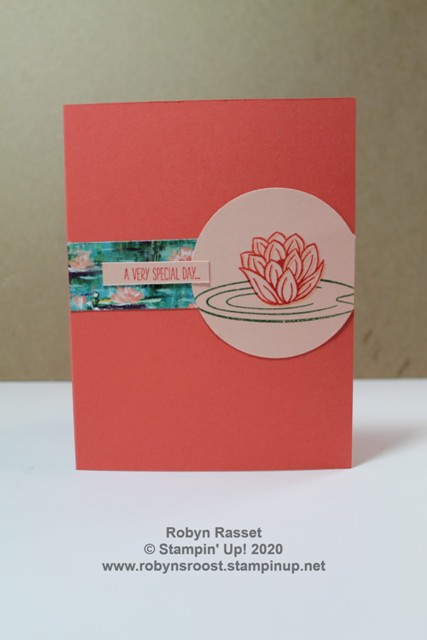 I used the Lovely Lily Sale-a- Bration stamp set and the Lily Impression Designer Series Paper. I really like the way the lily nestles into the lily pad. I have a pond garden and try to grow water lilies. Some years I’m successful, some years not. I guess gardening and card making do have something in common, lol. I’m always thinking about next year for my garden, especially now, when it’s covered in snow. Some Minnesotan’s fly south, I start looking through garden catalogs, when I take a break from my stamp room.
