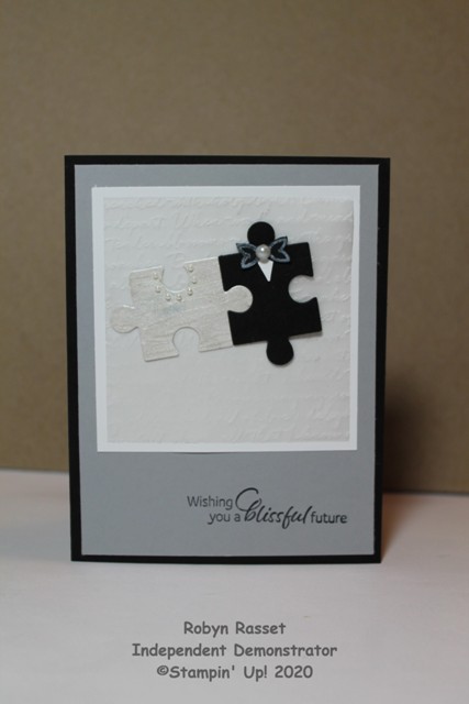 I cut out the 2 puzzle pieces and wanted to make the white one just a little more glamorous so I painted it with Frost White Shimmer Paint. Then I added some tiny pearls to the puzzle piece neckline. For the black puzzle piece, I used the Christmas Tree Punch tip for the white shirt and the bow tie was a flower stamp from the Around the Corner stamp set inked with white craft ink and a pearl is added between them. They are layered onto a piece of vellum that is 3 1/4″ square and embossed with the Script embossing folder.