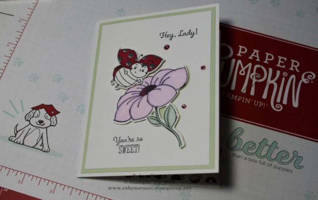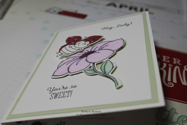 8.  Color the wings and back of the little lady bug with dark Cherry Cobbler Blends.  Cut out using the matching die.  Double layer Stampin’ Dimensionals to raise the ladybug above the flower.