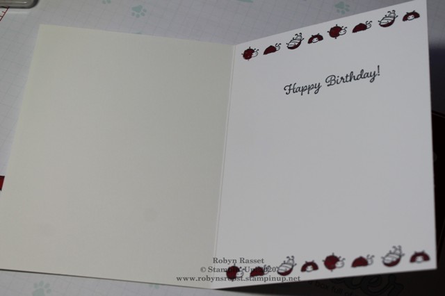 10.  Stamp the row of little ladybugs twice along the top and twice along the bottom on the insie.  Add the Happy Birthday greeting. Use the Dark Cherry Cobbler to color in the shells or just leave black and white.