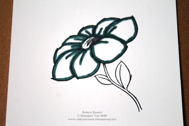 2.  Use the Dark Stampin’ Blend Mark from your chosen color and outline all of the petals on the flower. Outline all of the lines including the ones coming from the center.