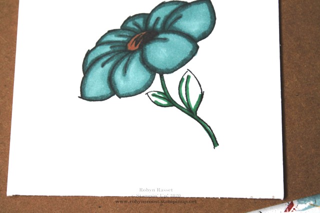 5.  Color the leaves and stem with a green Stampin’ Blend.  Use the dark green color right under the flower and where the leaves meet the stems. Then go over everything with the lighter green.