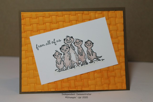 These cute little Meerkats are part of the Gangs All Meer Sale-a-Bration stamp set. The set includes 6 image stamps and 3 greetings and can be earned with a $50 order during Sale-a-Bration which ends March 31. 2020. The 3D Basket Weave Embossed background makes me want to call this card a basket of Meers. I’ve colored the meers with a mix of espresso, black and white Watercolor Pencils and then blended them with a Blender pen. The ground is very lightly colored with old olive.