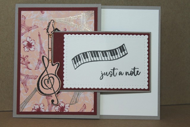 This card is my favorite! Robin’s card is simple and elegant and just perfect. My favorite part is the wavy edge created by the piano keys. It’s hard to see on the photo, but the wavy piano key edge is fussy cut and the strip below is black foil.