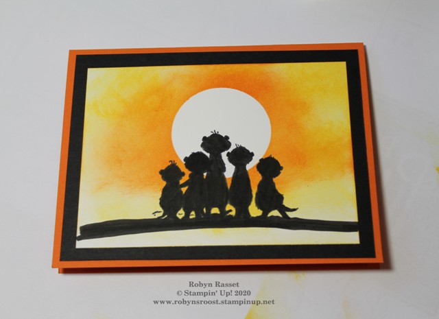 Remove the mask and stamp the meers with Tuxedo Black so that part of their heads are in the white area of the sun. I used the Basic Black Stampin’ Write Marker to color in all of the meers and then added s swish of black at their feet to ground them.
