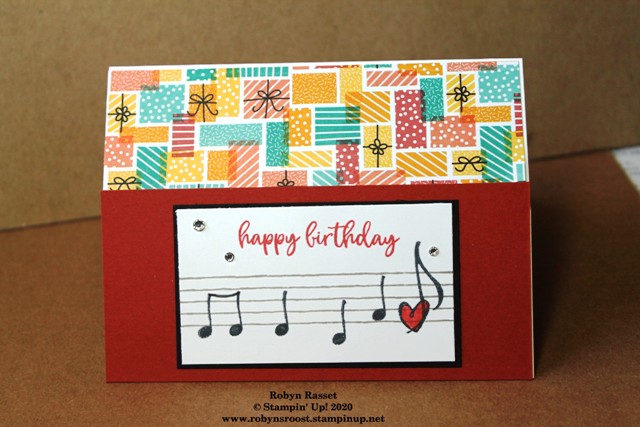 4. Cut a piece of Whisper White 3 1/2″ x 2″. Stamp the happy birthday greeting with Terracotta ink, the music lines with Granite Gray, The notes with Tuxedo Black. Color in the heart note with a Terracotta Tile marker. Layer onto a piece of 3 3/4″ X 2 1/4″ Basic Black and center onto the Terracotta Tile layer. Add 3 Rhinestone Jewels.
