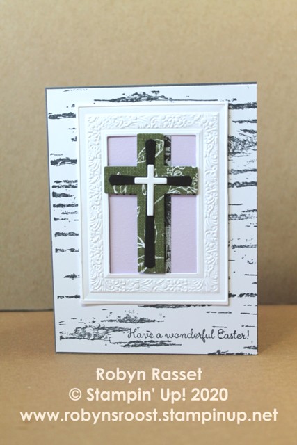 My card is Clean and Layered. I started with a background stamped with the Birch Background stamp. The frame is created with the Heirloom Frames Dies and the crosses are all created with the Crosses of Hope Dies.