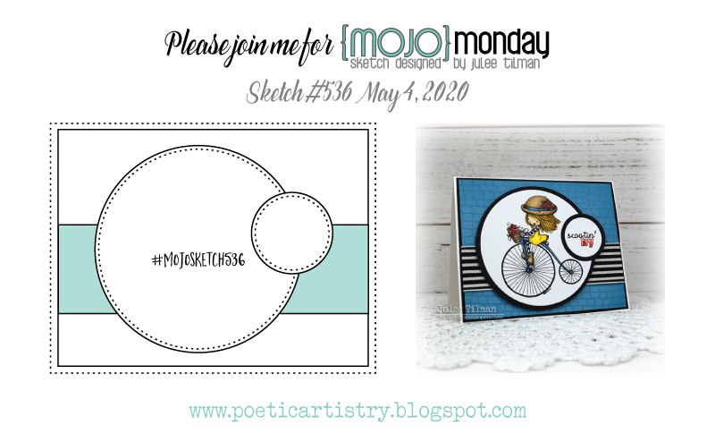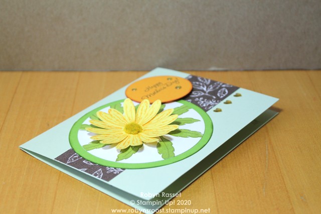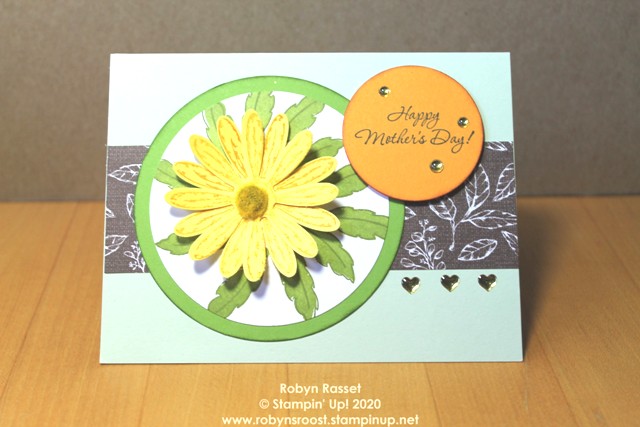 I used the MOJO #536 layout for the starting point of this card. I pulled out the Daisy Delight stamp set which is retiring soon, to create a 3D daisy with the Daisy Punch. I decided to add some leaves behind the daisy. As a finishing touch, I found some epoxy hearts in my stash and thought that they added a nice touch.