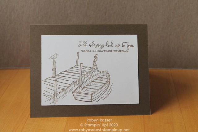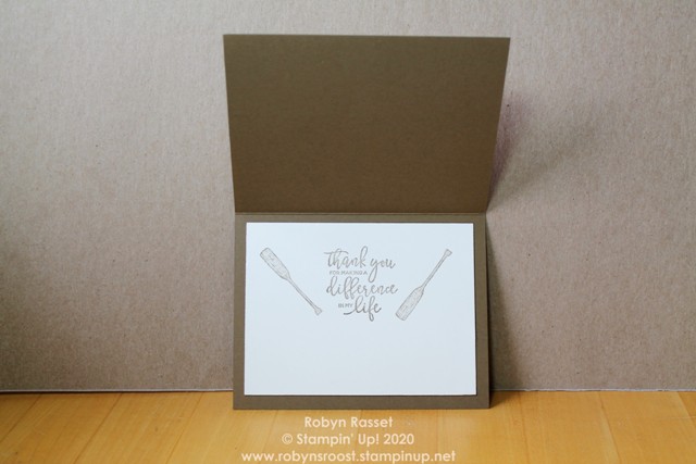 For the inside of the card, I added a greeting and some paddles, also stamped with Soft Suede ink. I couldn’t make up my mind which way to orient the paddles so I did them both differently. Maybe, they would have looked better flat along the bottom?