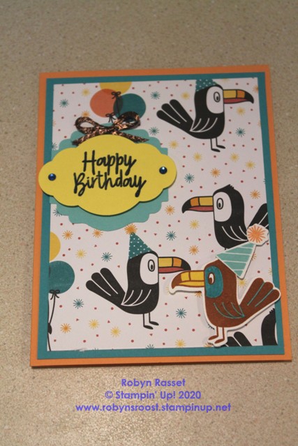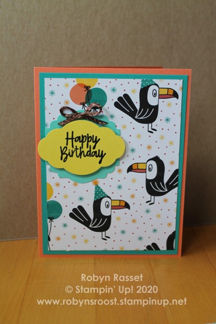 I added a die cut toucan and some rhinestones. The toucan is done in cajun craze ink with bermuda bay highlights and a pineapple punch bill. I’ve popped him up with dimensionals.