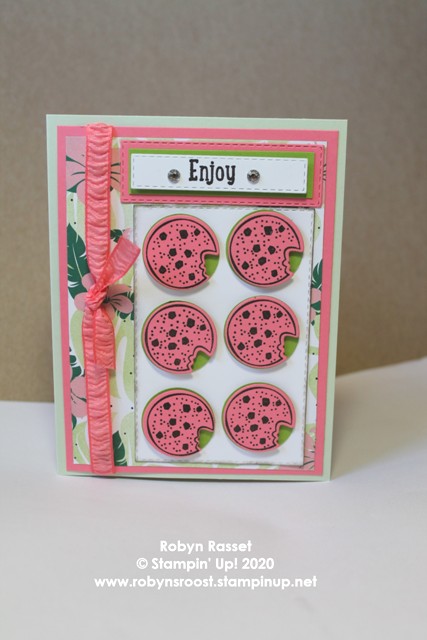 This fun inspiration photo gave me SO MANY ideas that I wasn’t sure which one to start with. The flamingos where a possibility, the black and white striped cake was one, the cake even made me think of a hat! I finally settled on the watermelon jello cups, but the chocolate chip “seeds” made me reach for the Nothing’s Better Than stamp set with the cute chocolate chip cookie.