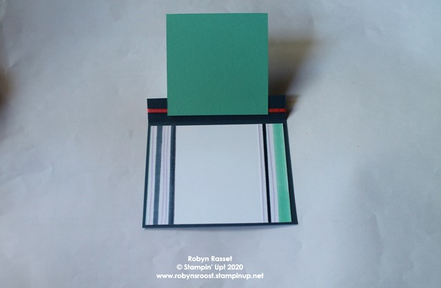 Direction #3: Adhere the 1″ strips of DSP to the ends of the white 4″ x 5-1/4″. Adhere this to the inside of the cardbase. The card will be in the landscape orientation.