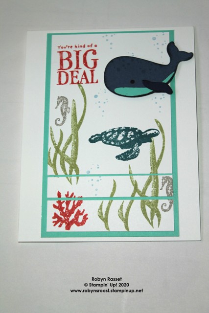 The Slice & Dice Technique is very simple but creates a unique look. For this card the panel starts with a piece of Whisper White paper that is 3″ x 4 3/4″. Stamp the design (This card uses the Whale Done stamp set and matching Whale Builder Punch). Once all of the design has been created, slice & dice a 3/4″ strip and then a 1/2″ strip. Adhere to a 3 1/4″ x 5 1/4″ layer of Coastal Cabana. For different looks, try starting with a different size, or shape piece or try slice & dicing different widths. Have fun with this technique!