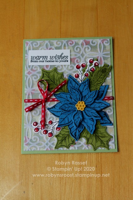 Try switching up a red poinsettia for a blue one to get a different look with the Poinsettia Petals stamp set and Poinsettia Dies. The Plush Poinsettia Speciality in the background is a beautiful flocked vellum. Some of the designs have images that can be cut with the Poinsettia Die. For this card I layered the Plush Poinsettia paper on top of a piece of Poinsettia Place Designer Series Paper. Both are cut to 4″ x 5 1/4″.