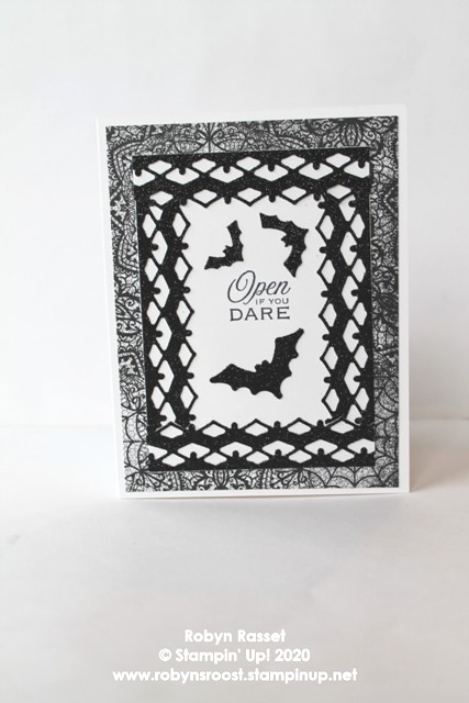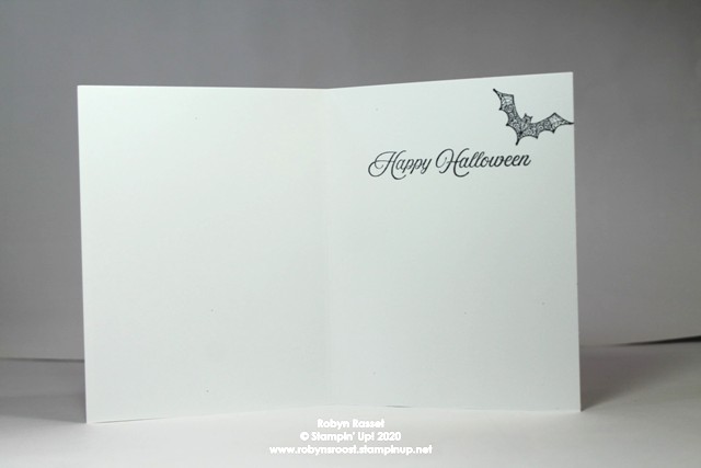 I left the inside of this card fairly simple, with just a Tuxedo Black ink greeting and a single bat. The pretty filigree bat stamp can also be die cut with the bat die. There are 2 bats on the stamp and on the die. To stamp just one bat, I carefully inked just one of the bats.