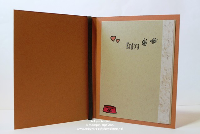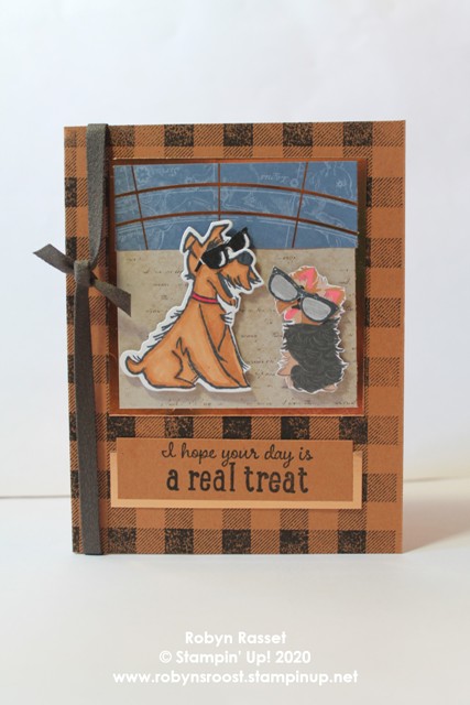 I chose to stamp and color the larger dog with Cinnamon Cider Stampin’ Blends, I LOVE THE CINNAMON CIDER color! The little dog is fussy cut (scissors) from the cute Playful Pets Designer Series Paper. I also colored the little guy’s glasses with Smoky Slate because I had stamped them on whisper white but it was just too white and needed to be toned down. Both dogs are popped up with dimensionals.