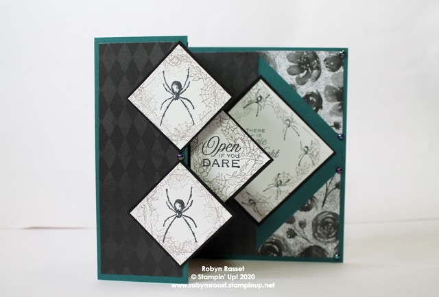 I decided to make a Fold Back Pop Up card using the Hallows Night Magic stamp set. The large spider is a perfect size for the diamond pieces. I used the label image stamp and stamped with Gray Granite ink around all 4 sides of the white diamond pieces before stamping the spiders. I was undecided about the center diamond, whether I should put another spider there or the words, but I decided to go with the words. For the large diamond on the inside of the card, I used the same technique, stamping the label image around the edges, but I did use a post it note to mask off the center area while I was doing the stamping on this larger piece. Then I added the little spiders all the way around the diamond. For directions and dimensions to create the Fold Back Pop Up card go my blog from Easter https://robynsroost.blog/2020/03/30/fold-back-pop-up-easter-card/just substitute the Halloween items for the Easter ones. For this card, I decided to put the Iridescent Pearls on the corners and the spot between the large spiders, but they do add a pretty cool effect to the spiders if you add one to the head and one to the body