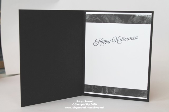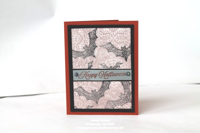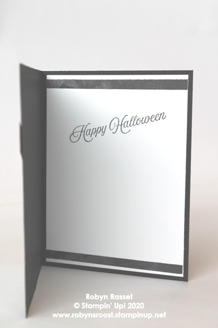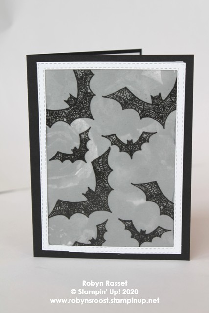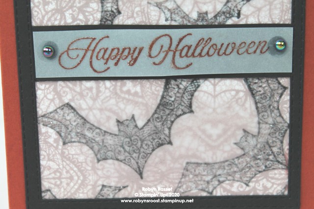 To get embossed colors to match the cardstock colors, I stamped the bats with Tuxedo Black and the greeting with Cajun Craze ink and them sprinkled with Clear Embossing Powder. The trick is to work quickly between stamping the ink and sprinkling the Embossing Powder because the ink dries much more quickly than VersaMark.