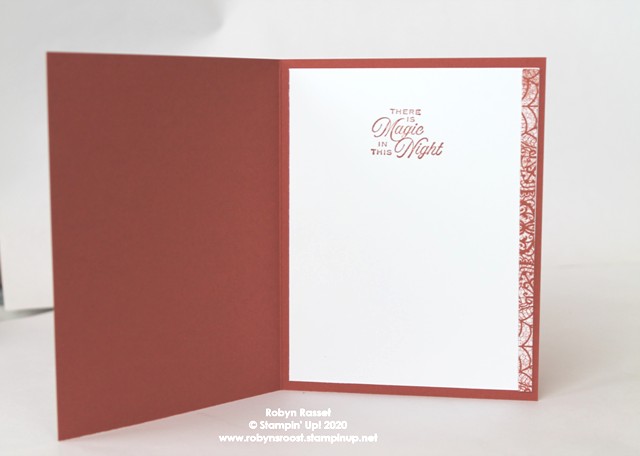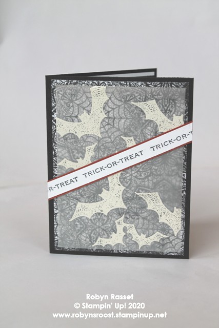 For this card I cut the vellum paper 1/4″ smaller than the Magic in This Night Designer Series Paper and let the designer series paper act as a frame. I really like the foggy mysterious look of the vellum over the Magic in This Night Patterned paper.