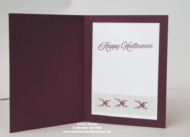 To finish out the inside of the card, I’ve added a whisper white piece cut with the Stitched Rectangle Frames Die and stamped the greeting with Blackberry Bliss. I had a row of the Clear Embossed spiders on the Vellum cardstock left over so I added that to the bottom of the Stitched Rectangle piece.