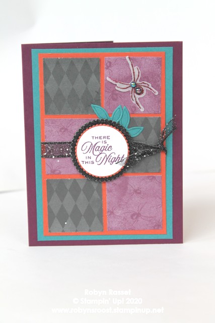 For this card start with 6 pieces of Magic in This Night Designer Series Paper cut into 1 1/2″ squares. Layer the squares onto a 3 3/8″ x 5″ piece of Cajun Craze cardstock. The sparkly Black Glittered 3/8″ Organdy Ribbon is tied around the Cajun Craze layer and knotted. The sparkly Black Glittered Organdy ribbon is great for all year round not just for Halloween.