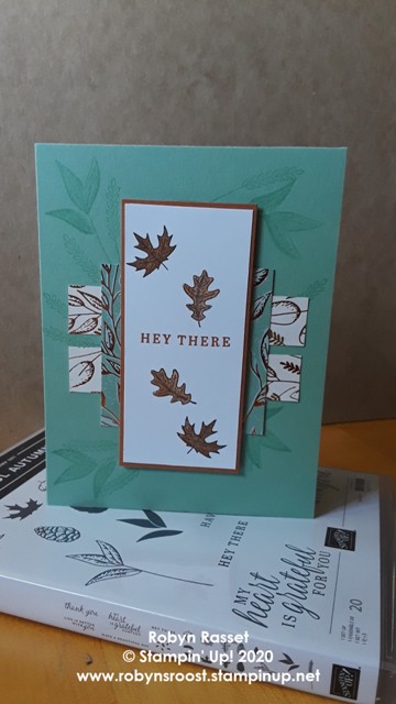 For the Grateful card, the Mint Macaron cardbase was left unstamped. I left off the extra layer of Cider cardstock that was under the whisper white greeting layer on the Hey There card. Here are the measurements for the Grateful card: