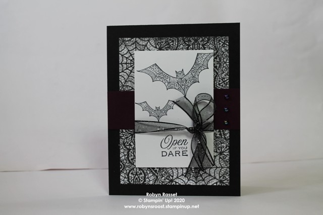 I love the elegant filigree bats! Both bats are on one stamp so it only took one stamp for the image and another one for the greeting. The Black Glittered Organdy Ribbon adds a bit of sparkle along with the Iridescent Pearls.