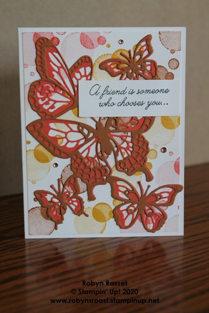 Layer the 2 large butterfly dies from the Butterfly Beauty Dies set for a pretty focal point. These butterflies are done in Calypso Coral and Cinnamon Cider. The background is stamped with the bubble stamp in three colors, Cinnamon Cider, Bumblebee, and Calypso Coral. Add 3 of the Champagne Rhinestone Jewels to add some sparkle.