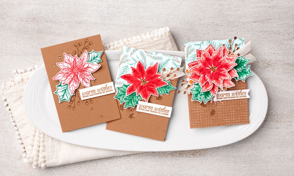 Now for the cards that I want to share today. These cards were shared by Stampin’ Up! and I thought that they were such a great example of using the Poinsettia Petals stamp set that I decided to share them with you.