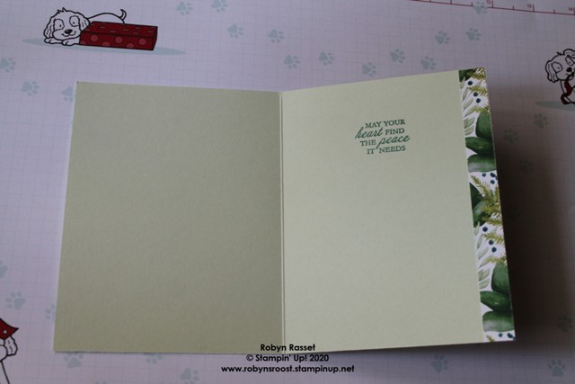 I love to use up my scraps by adding a strip to the inside. The Forever Greenery Designer Series Paper is so pretty. It pairs up well with any of the green cardstocks. I decided to use the Soft Seafoam for this card base. I matched up the ink and strip on the front by using the Just Jade In Color.