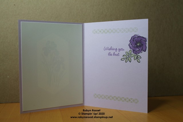 The inside view shows that the die was cut from the card front and the image was stamped on a panel that was placed behind the front. The images on the inside are done in the same colors and from the same Inspiring Iris stamp set.
