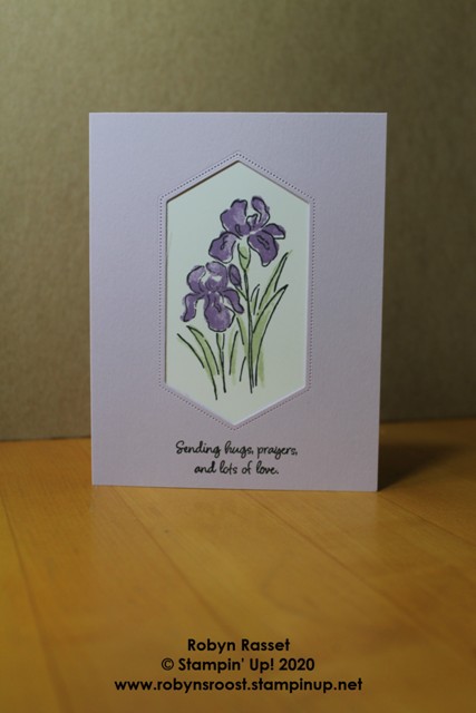 The 2″ x 3 3/4″ Nested Labels Die makes a perfect frame for the large Iris image from the Inspiring Iris stamp set. The soft, pretty Purple Posy colored card stock complements the Iris which is stamped with Highland Heather ink. I love how the 2-step stamps make it look like I water colored the image. The first stamp is the outline, then there is one stamp to color the flowers and another to color the leaves. Don’t worry about getting everything perfectly aligned.